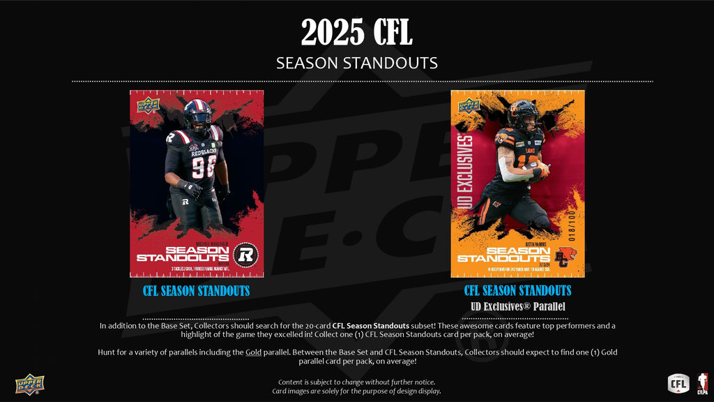 • In addition to the Base Set, Collectors should search for the 20-card CFL Season Standouts subset! These awesome cards feature top performers and a highlight of the game they excelled in! Collect one (1) CFL Season Standouts card per pack, on average!
