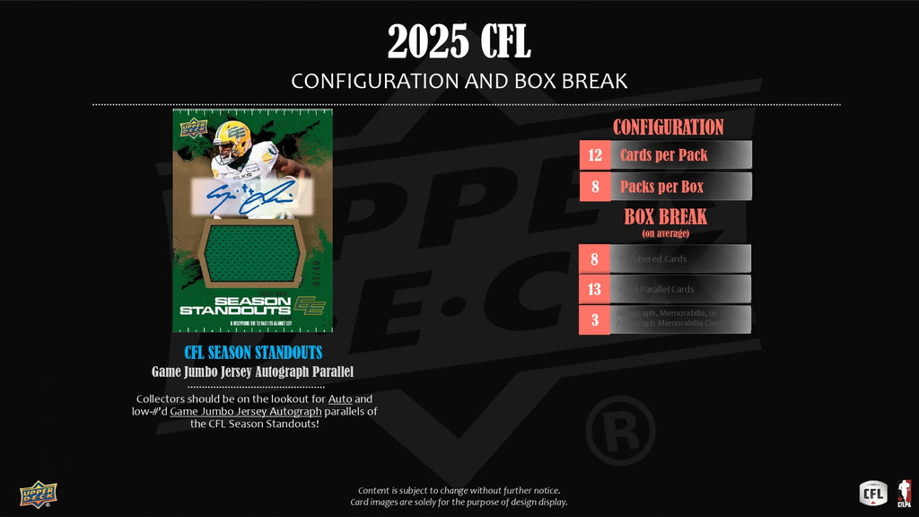• In addition to the Base Set, Collectors should search for the 20-card CFL Season Standouts subset! These awesome cards feature top performers and a highlight of the game they excelled in! Collect one (1) CFL Season Standouts card per pack, on average!
