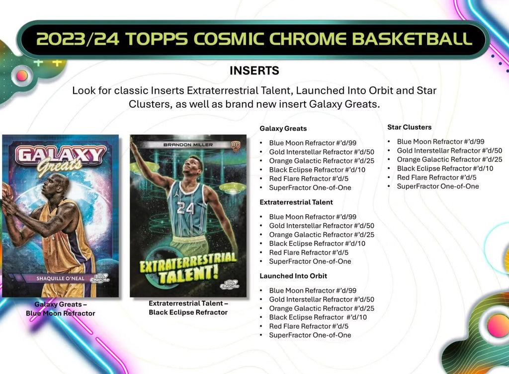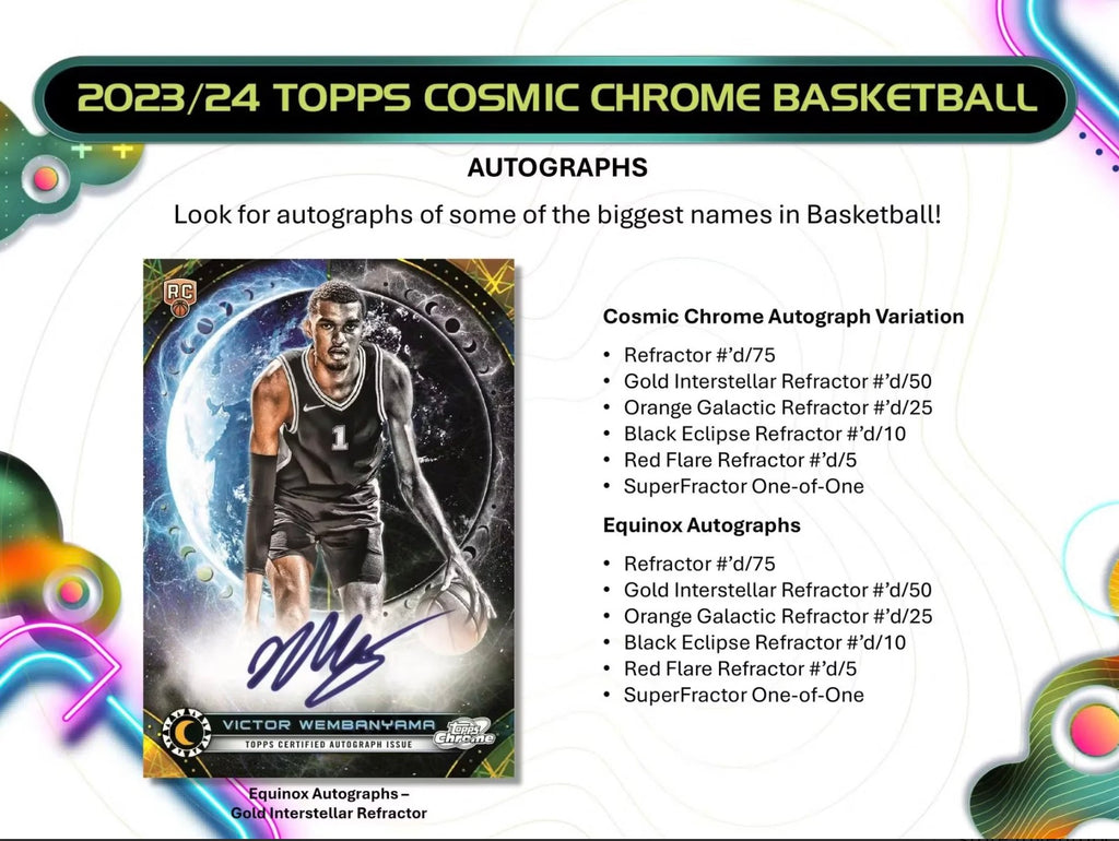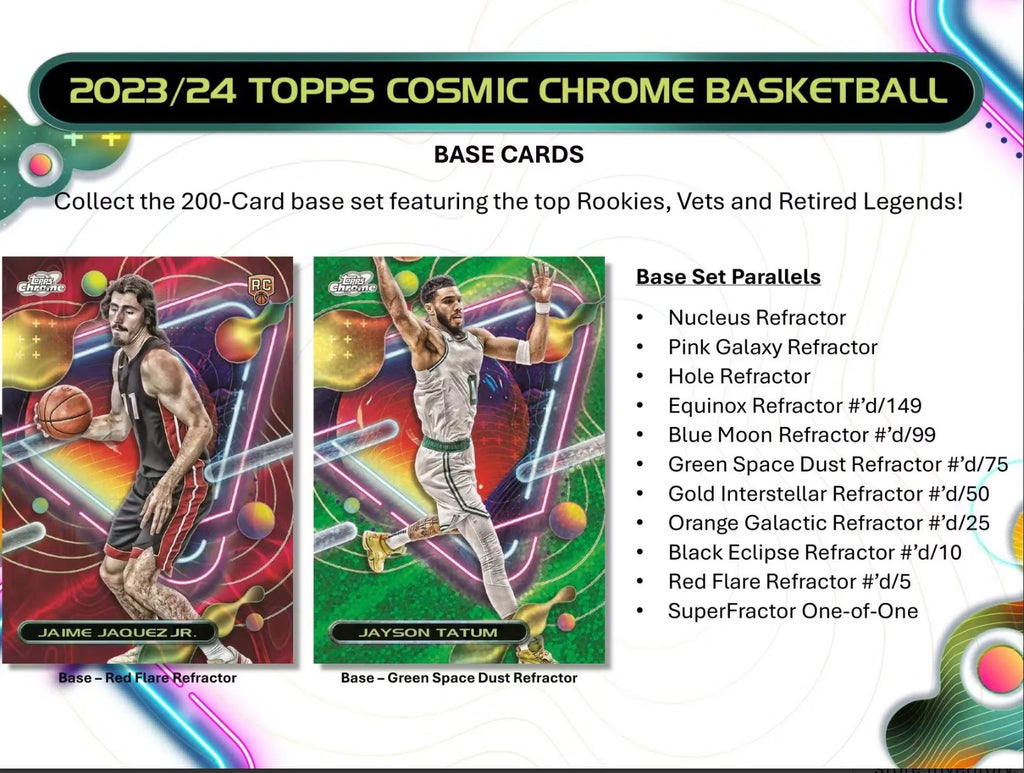 Collectors from all over the cosmos will be looking forward to Cosmic Chrome Basketball. Brand new to basketball in 2024, Cosmic Chrome will deliver a 200-card base set featuring some of the Biggest names in the basketball universe. Find autographs of the top Rookies, Vets and Retired Legends in the game.