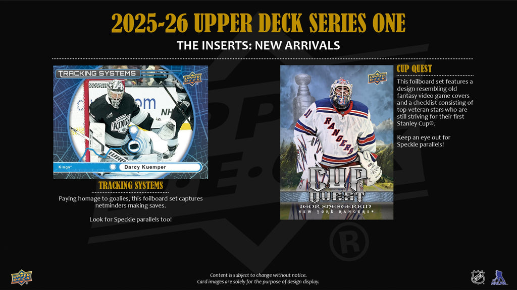 Tracking Systems: Paying homage to goalies, this set captures netminders making saves. All four sets are printed on foilboard. Keep an eye out for Speckle parallels of all four!